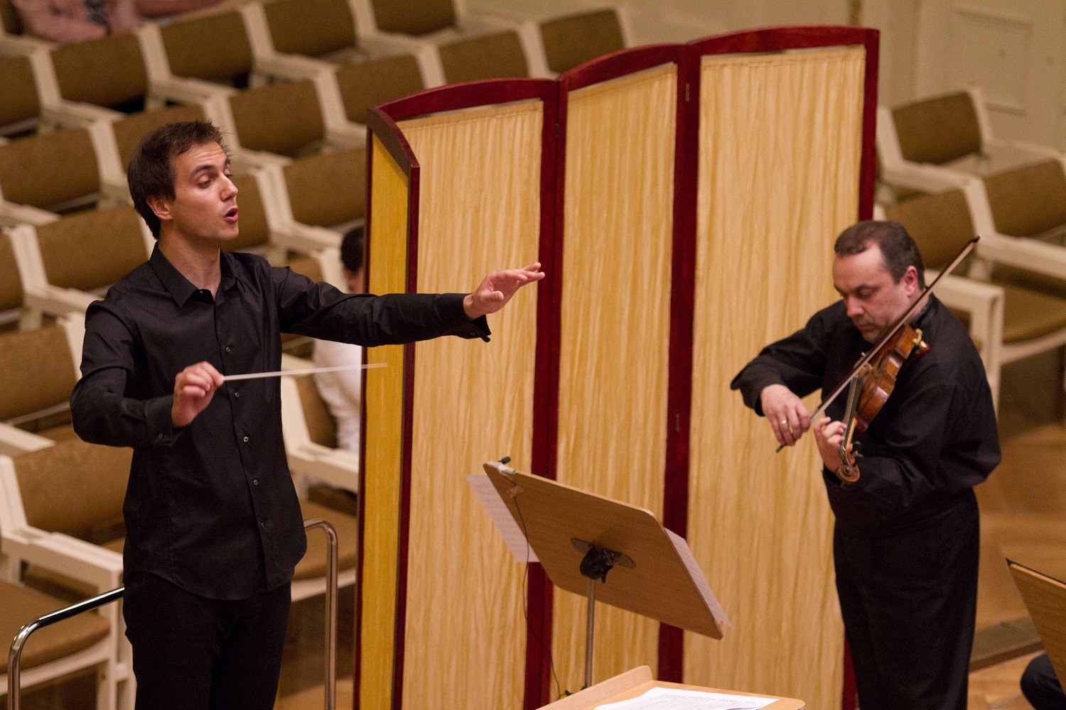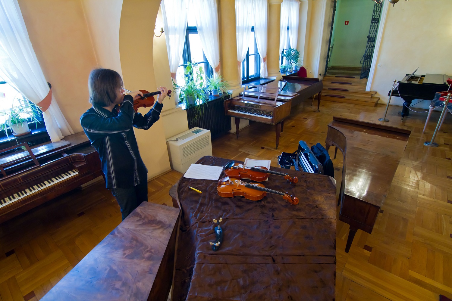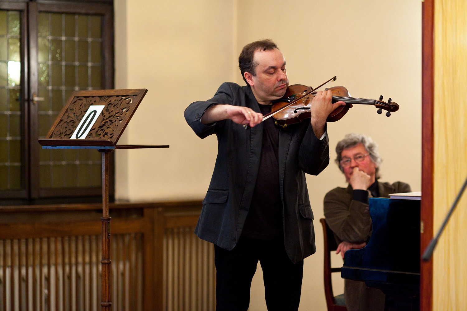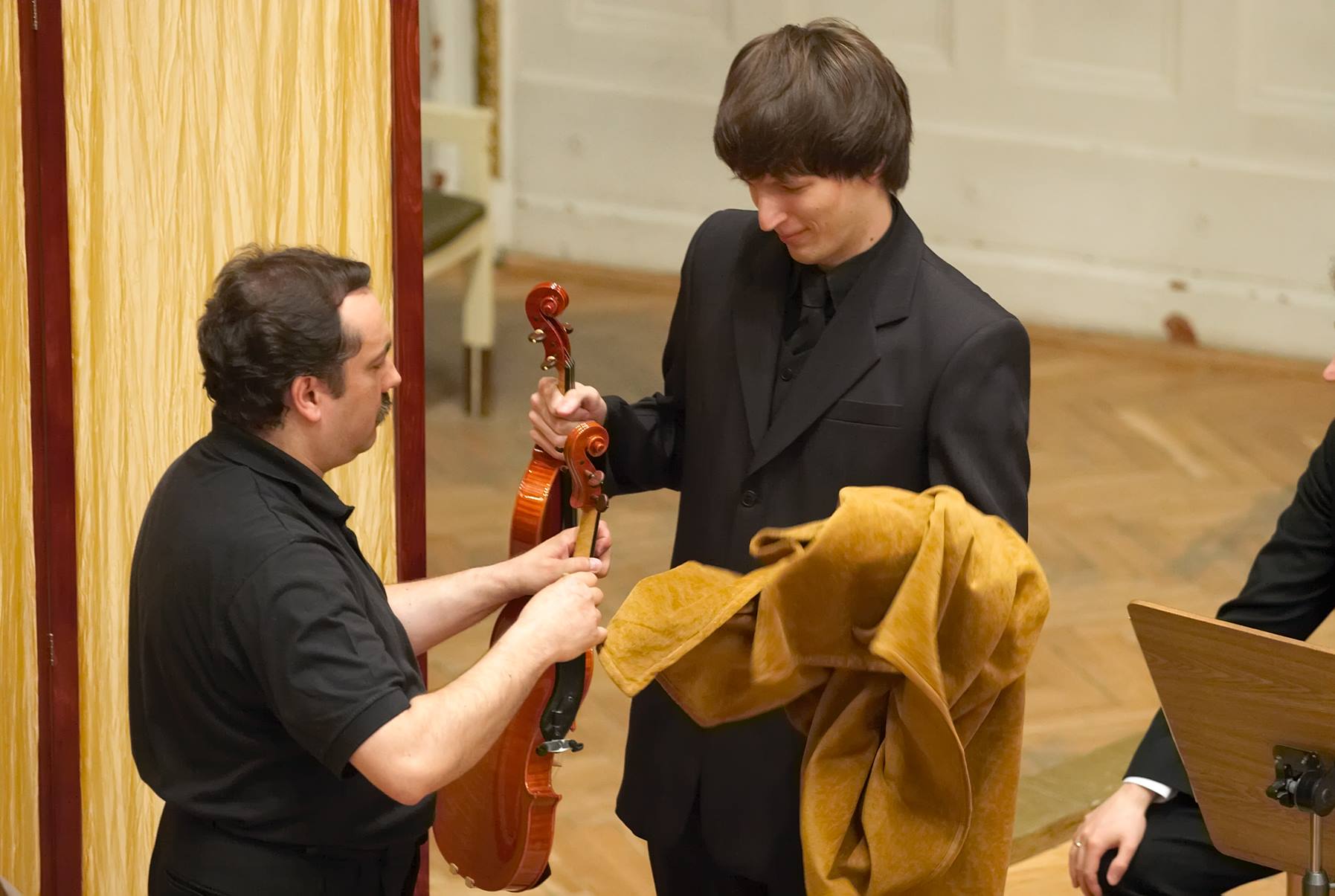 - 11. Międzynarodowy Konkurs Lutniczy im. H. Wieniawskiego (2006).Walory dźwiękowe instrumentu w warunkach kameralnych demonstruje zza parawanu skrzypek Bartosz Bryła z pianistą Arnoldem Dąbrowskim.