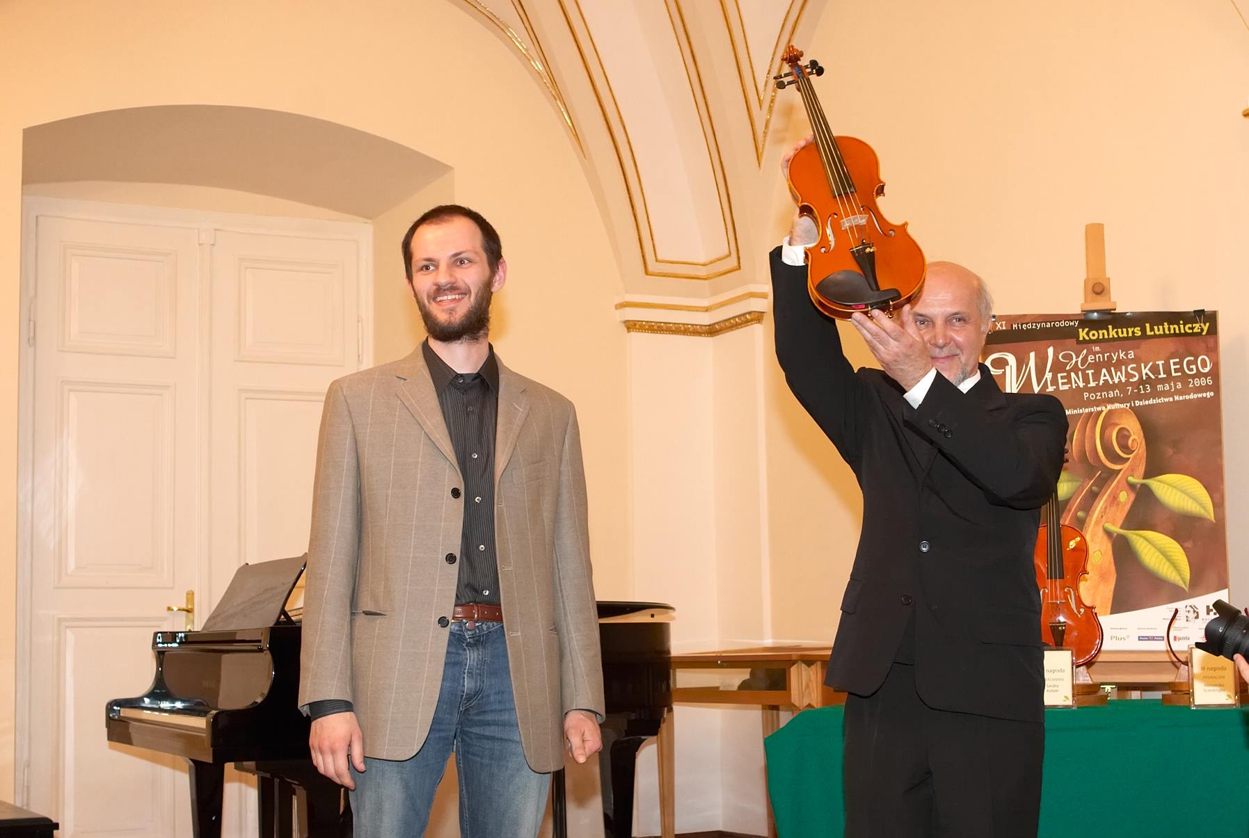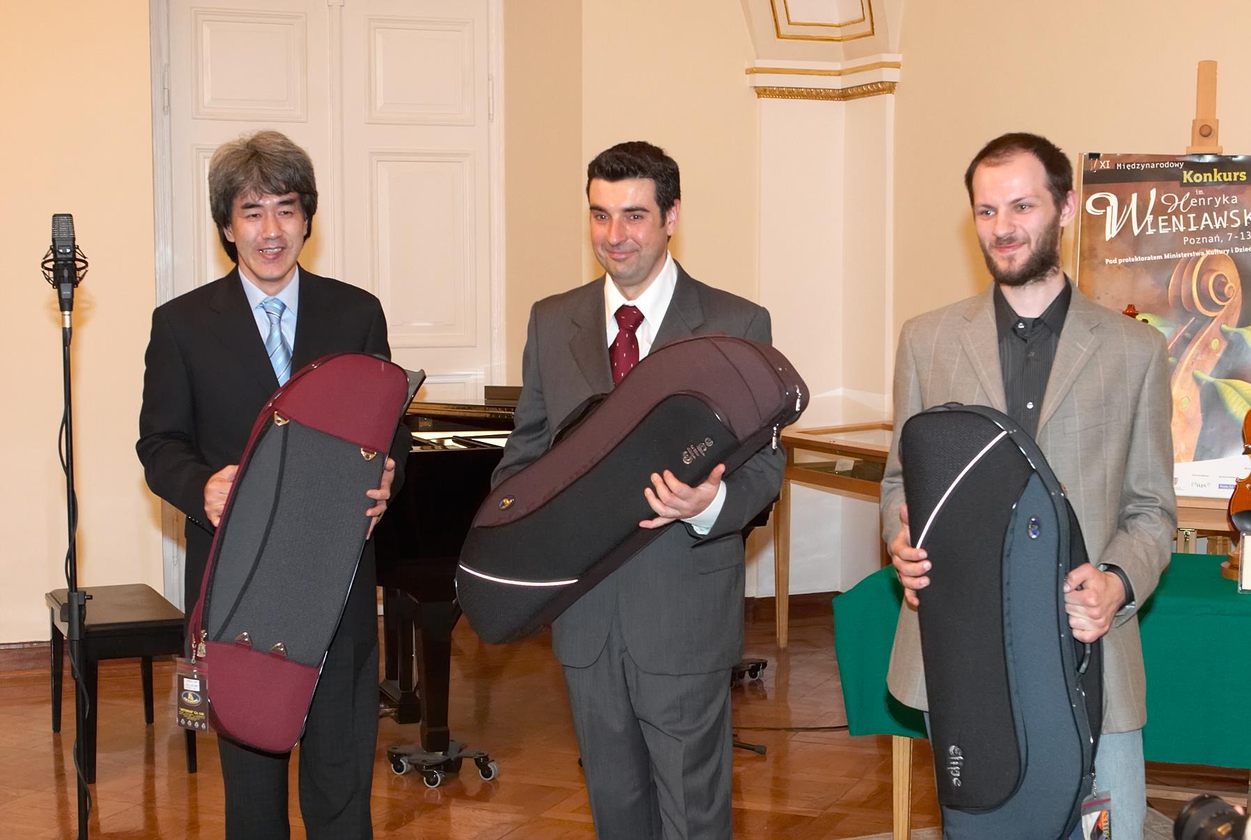- 11. Międzynarodowy Konkurs Lutniczy im. H. Wieniawskiego (2006). Zwycięskie skrzypce i ich twórca — Japończyk z… Cremony, Hiroshi Kikuta, laureat I nagrody i medalu za najwyżej ocenione walory dźwiękowe instrumentu. Obok: Gio Batta Morassi, przewodniczący jury i Andrzej Wituski, dyrektor Konkursu.