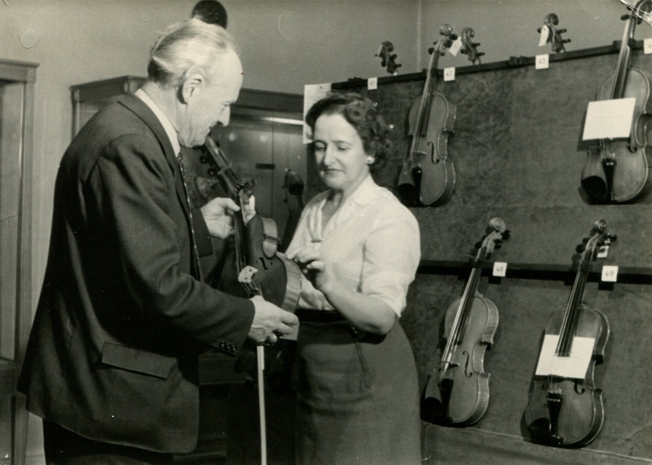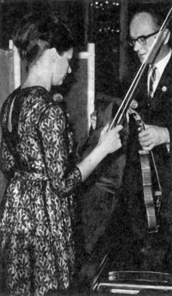 - 1. Międzynarodowy Konkurs Lutniczy im. H. Wieniawskiego (1957). Jurorzy podczas pracy: lutnik Hermann Meinel i skrzypaczka Galina Barinowa.
