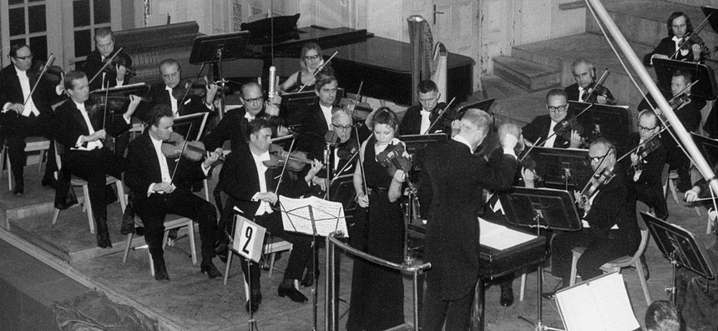 - 4. Międzynarodowy Konkurs Lutniczy im. H. Wieniawskiego (1972). Próby dźwiękowe w wielkiej sali koncertowej (Aula Uniwersytetu im. A. Mickiewicza); na estradzie Wanda Wierzbicka i orkiestra filharmoników poznańskich pod dyrekcją Renarda Czajkowskiego.