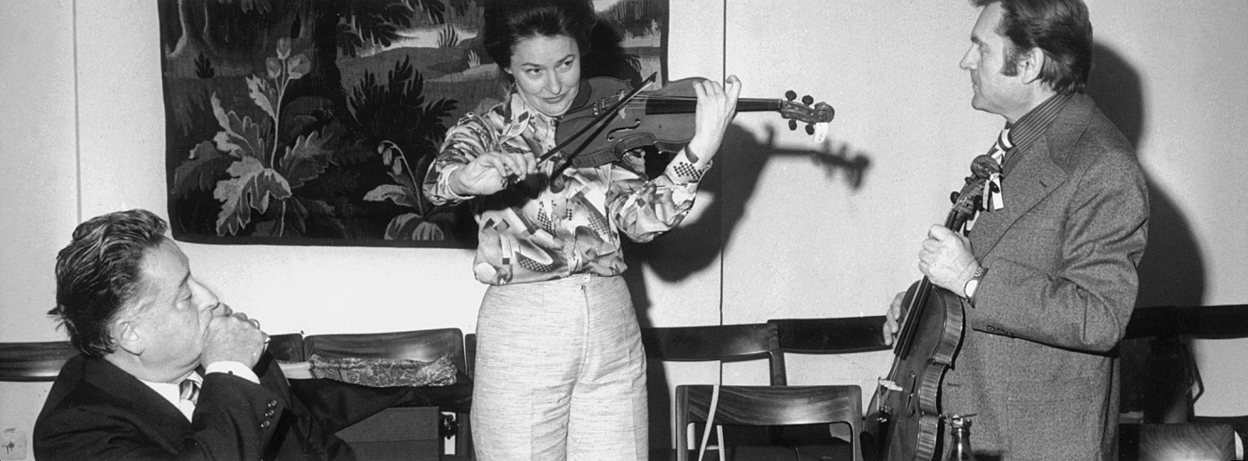 - 2. Międzynarodowy Konkurs Lutniczy im. H. Wieniawskiego (1962). Jurorzy przy pracy. Od lewej: Tadeusz Wroński, Louis Poulet, Eugenia Umińska i Irena Dubiska — podczas sprawdzania walorów dźwiękowych instrumentów.