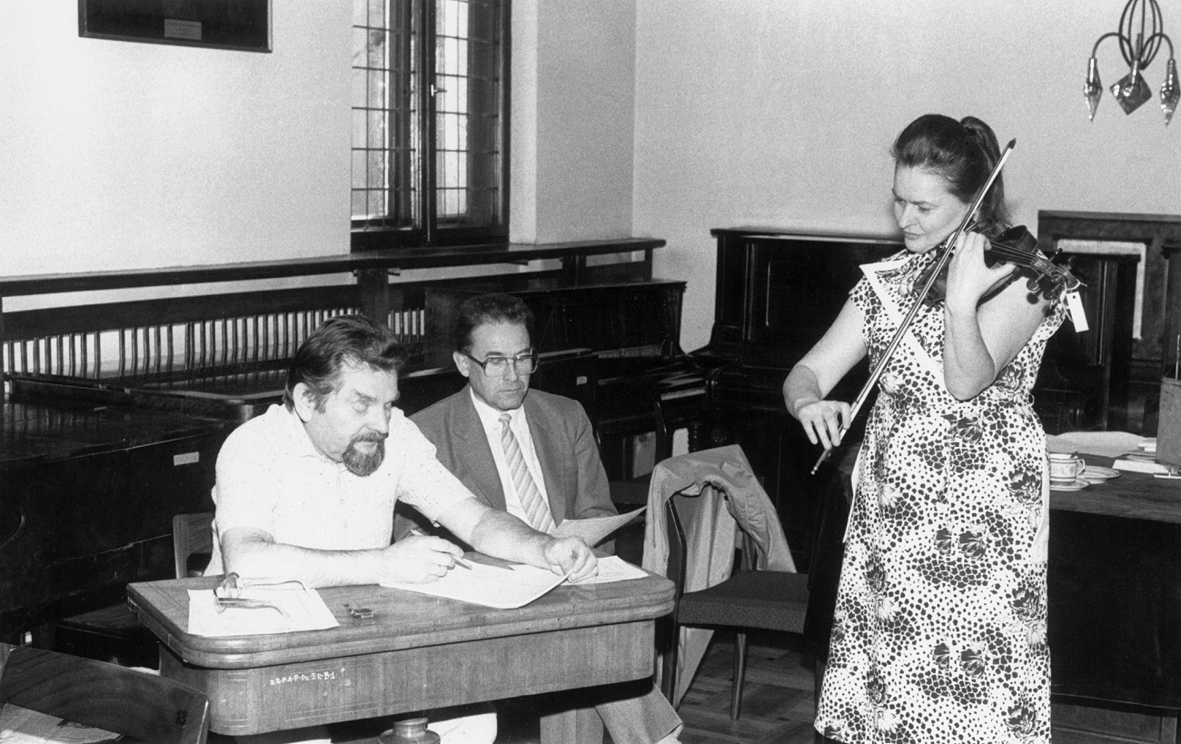 - 7. Międzynarodowy Konkurs Lutniczy im. H. Wieniawskiego (1986). Jurorzy przysłuchują się brzmieniu poszczególnych instrumentów.