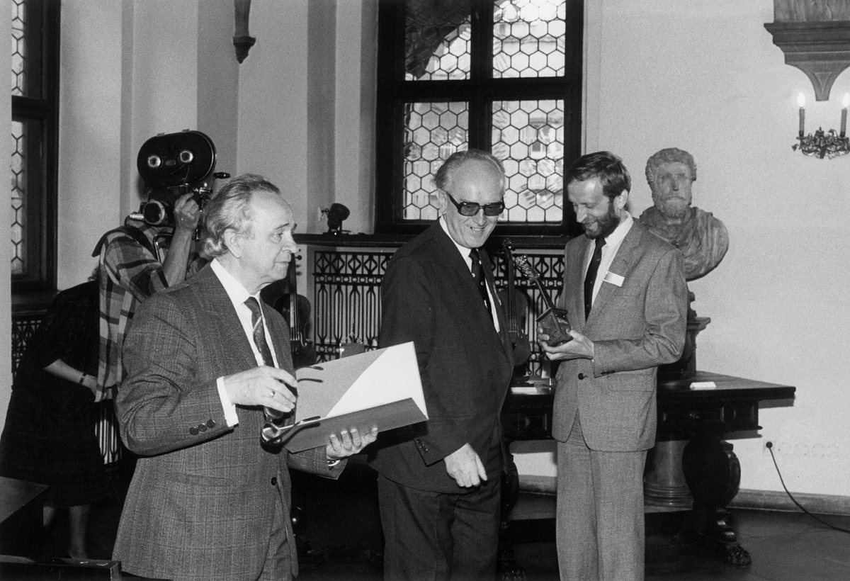- 6. Międzynarodowy Konkurs Lutniczy im. H. Wieniawskiego (1981). Laureaci Konkursu: P. Wiessmeyer (w środku) i J. Joo (z prawej) otrzymują medale z rąk Włodzimierza Kamińskiego – przewodniczącego jury i prezesa Związku Polskich Artystów Lutników.