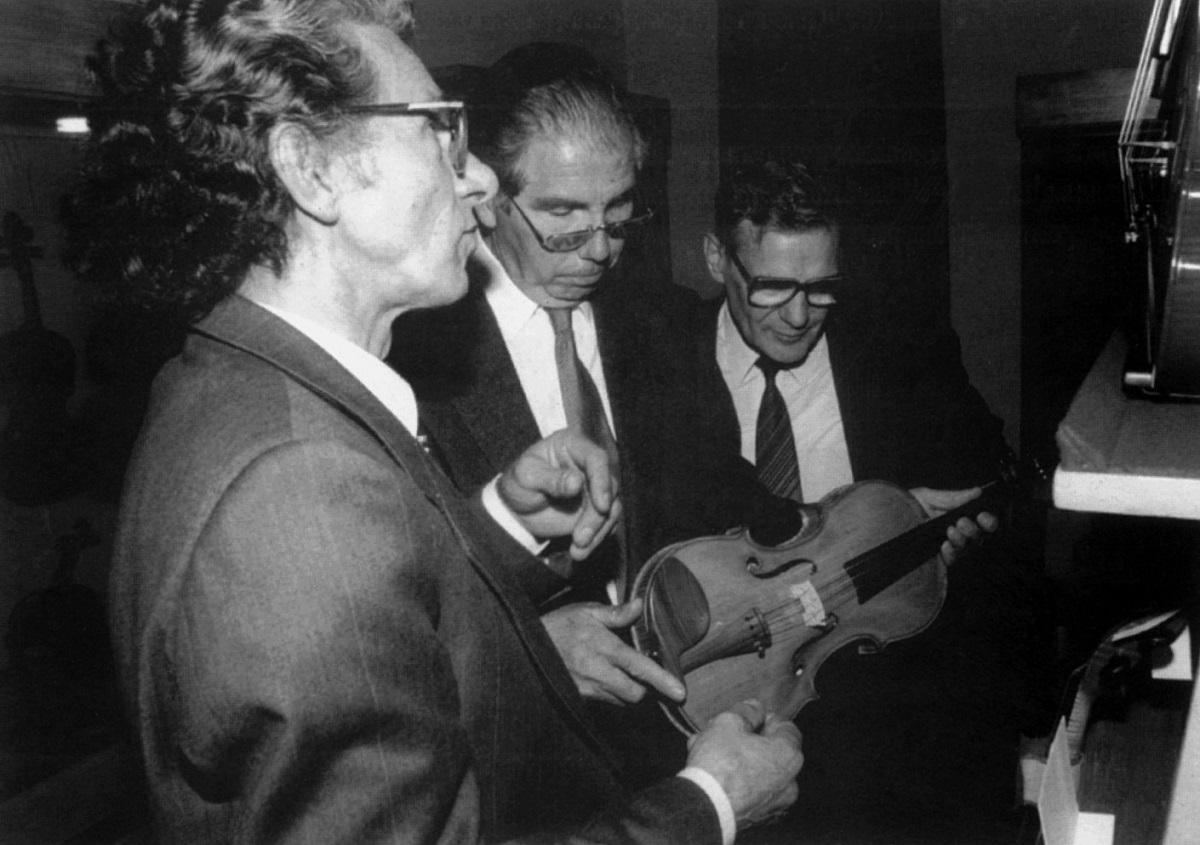 - 8. Międzynarodowy Konkurs Lutniczy im. H. Wieniawskiego (1991). Jurorzy oglądają jeden z egzemplarzy konkursowych skrzypiec. Od lewej: Gio Batta Morassi, Antonio Capela i Anatolij Koczergin.