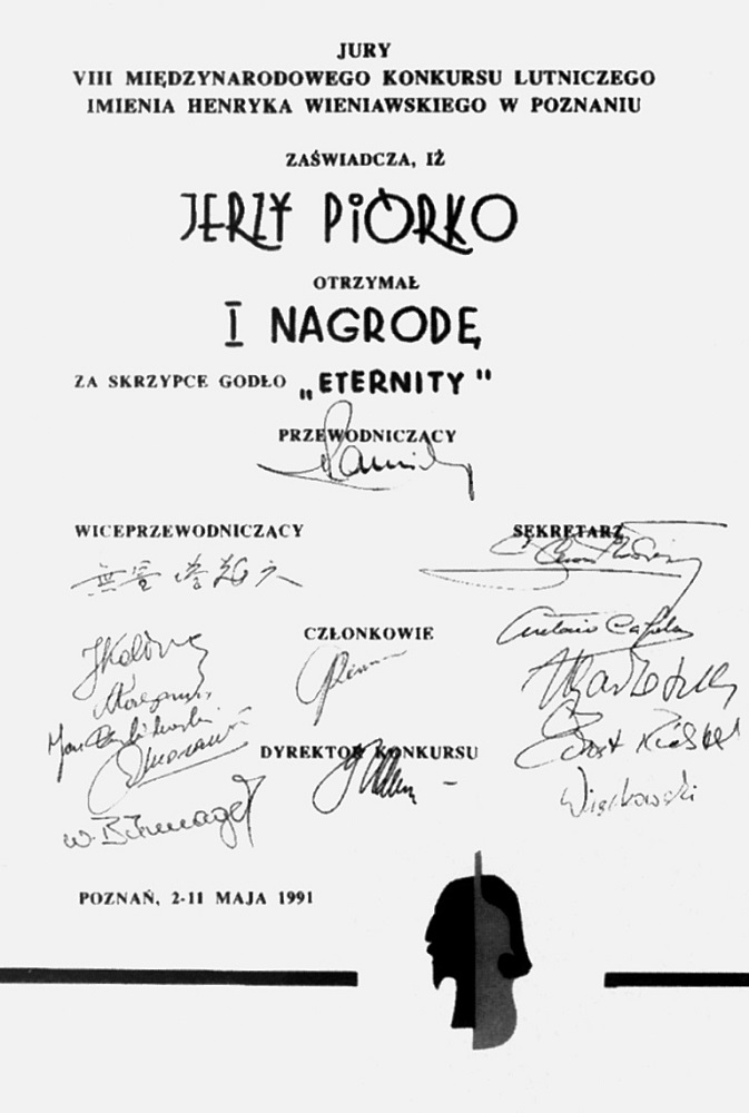 - 7. Międzynarodowy Konkurs Lutniczy im. H. Wieniawskiego (1986). Jerzy Piórko (Polska), III nagroda.