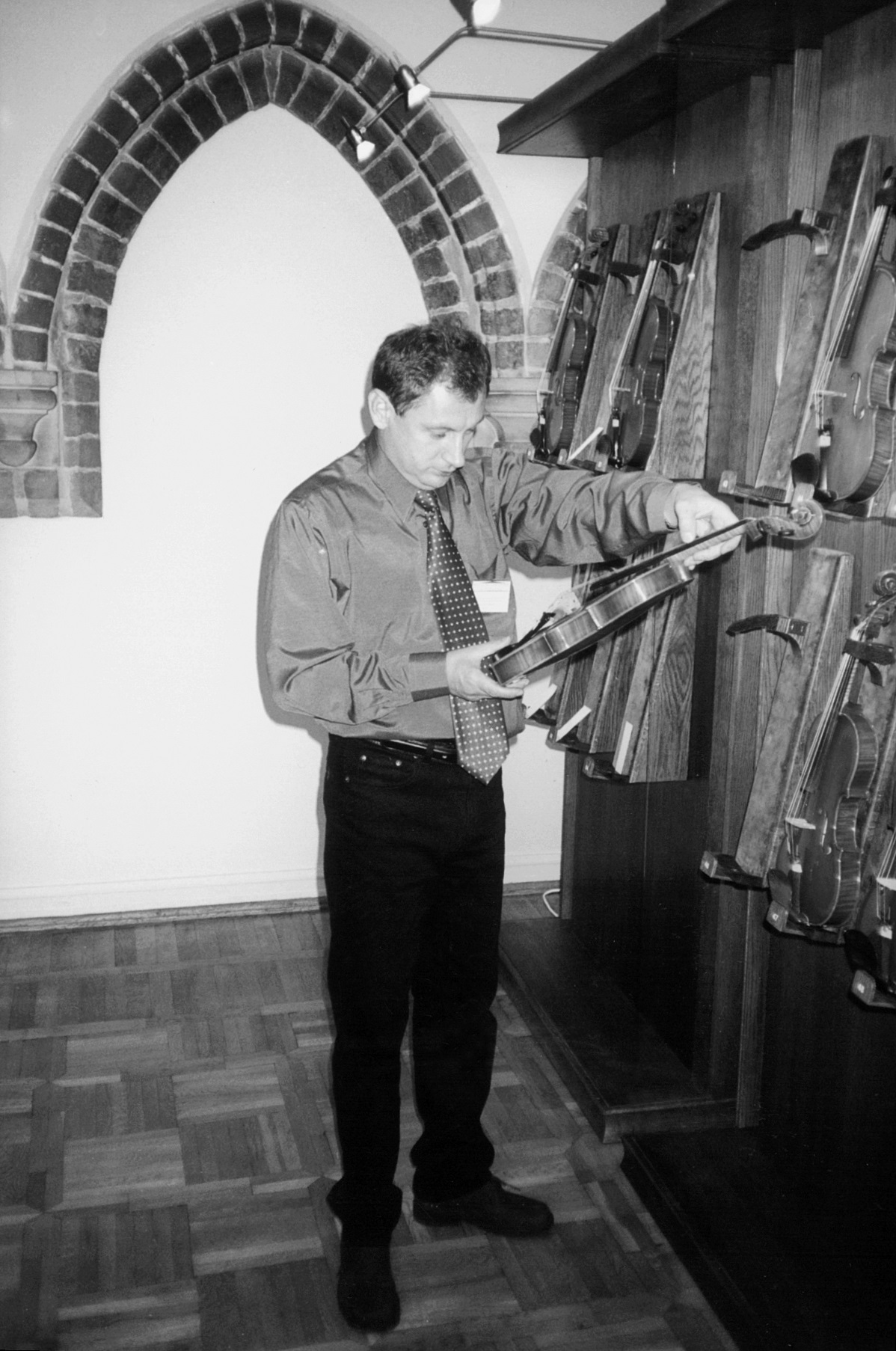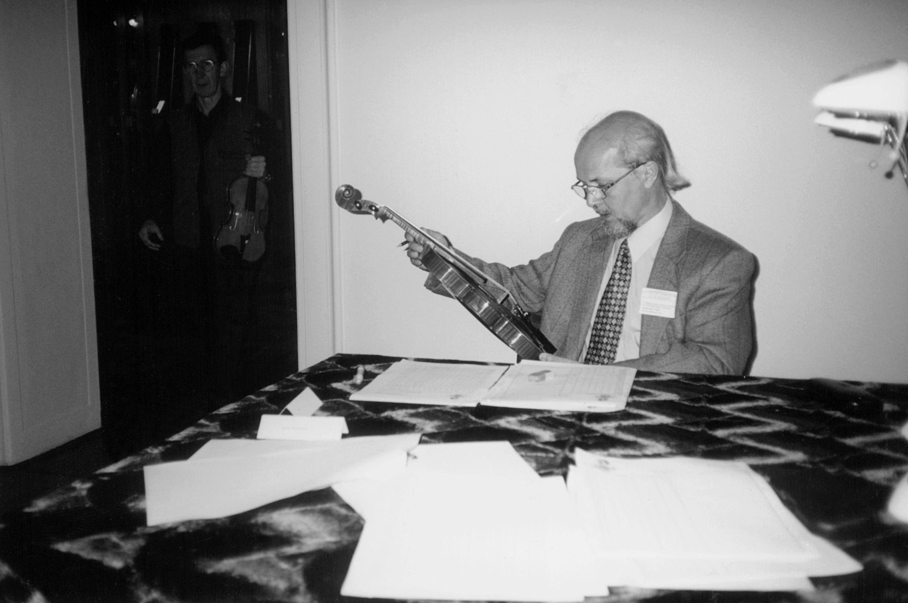 - 10. Międzynarodowy Konkurs Lutniczy im. H. Wieniawskiego (2001). Lutnik Wojciech Łukasz ocenia kolejny instrument konkursowy.