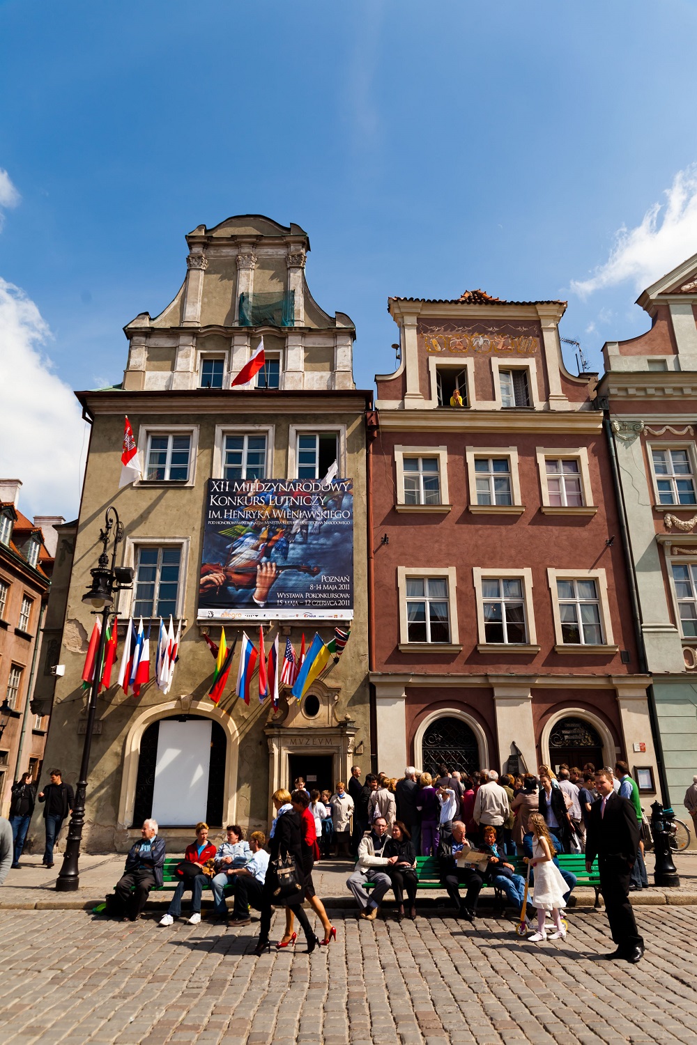 - 12. Międzynarodowy Konkurs Lutniczy im. H. Wieniawskiego (2011). Muzeum Instrumentów Muzycznych przyozdobione flagami krajów, z których pochodzą biorący w nim udział lutnicy oraz bannerem prezentującym plakat wydarzenia autorstwa Rafała Olbińskiego.