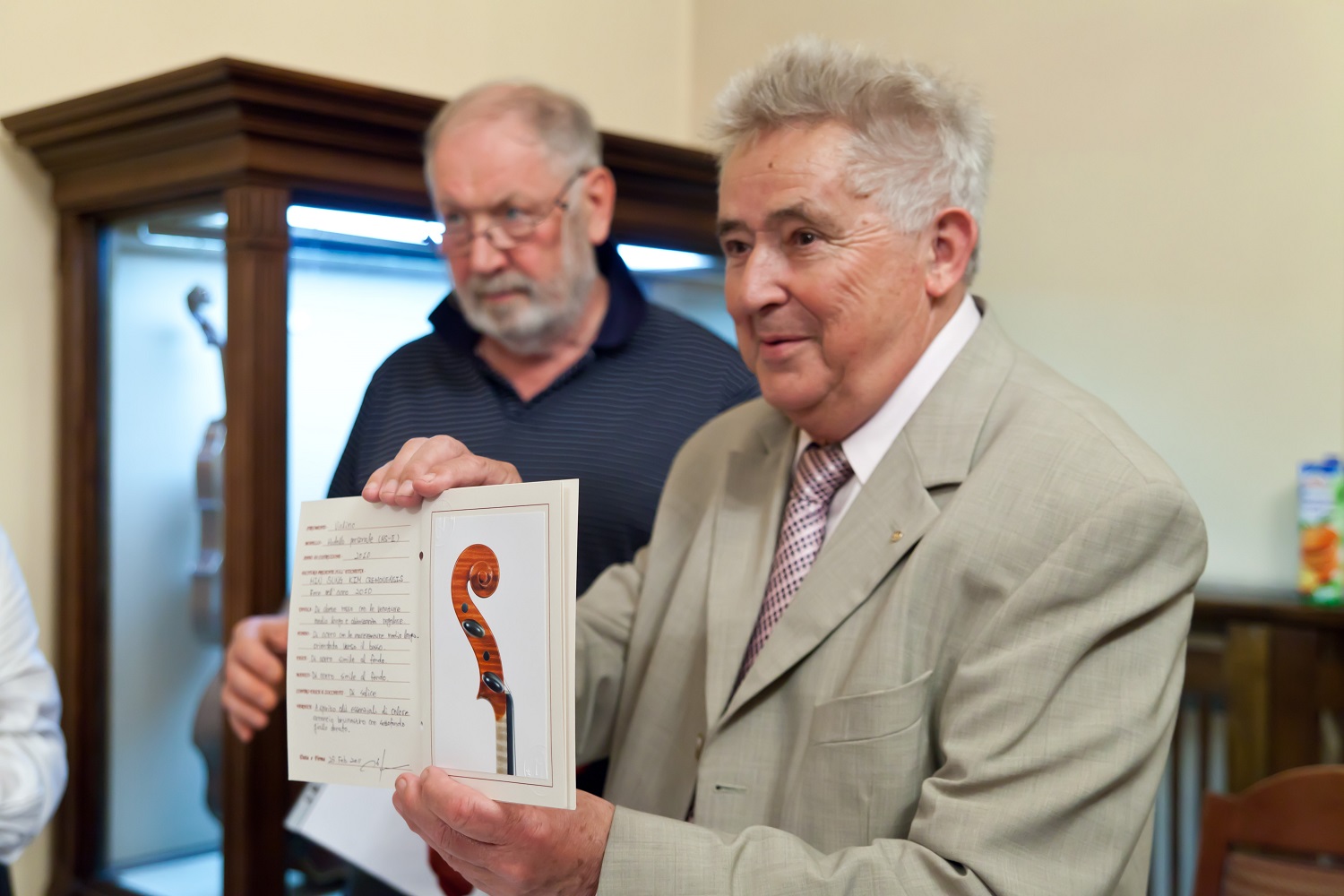 - 12. Międzynarodowy Konkurs Lutniczy im. H. Wieniawskiego (2011). Dyrektor konkursu Andrzej Wituski prezentuje jurorom kartę – wizytówkę zwycięzcy konkursu. W tle przewodniczący jury Roger Hargrave.
