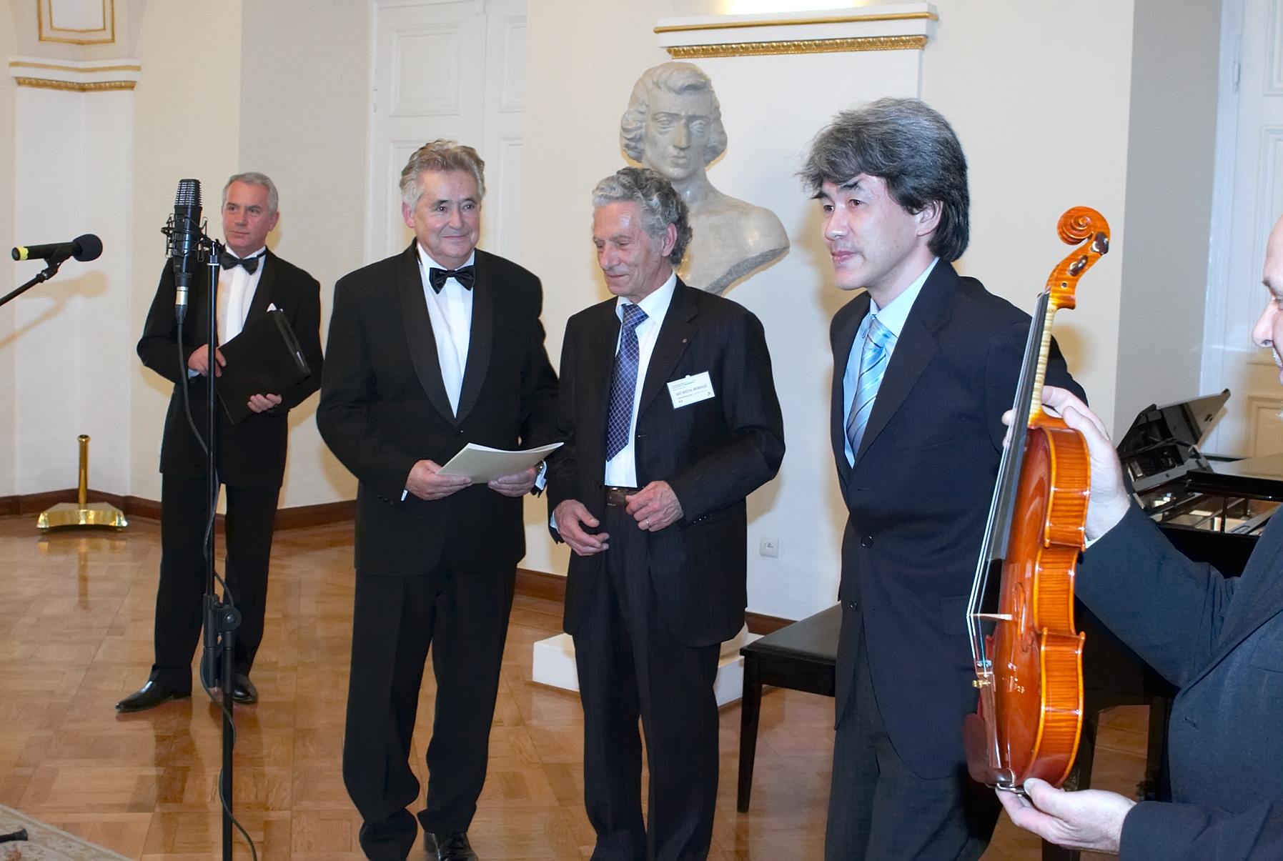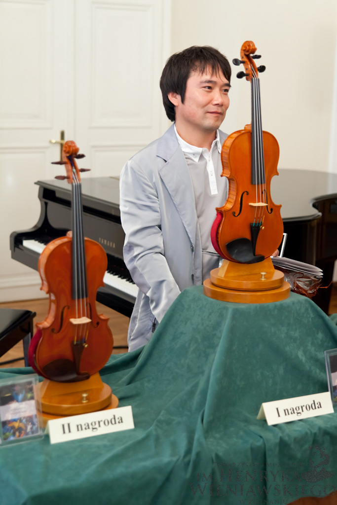 - 11. Międzynarodowy Konkurs Lutniczy im. H. Wieniawskiego (2006). Zwycięskie skrzypce i ich twórca — Japończyk z… Cremony, Hiroshi Kikuta, laureat I nagrody i medalu za najwyżej ocenione walory dźwiękowe instrumentu. Obok: Gio Batta Morassi, przewodniczący jury i Andrzej Wituski, dyrektor Konkursu.