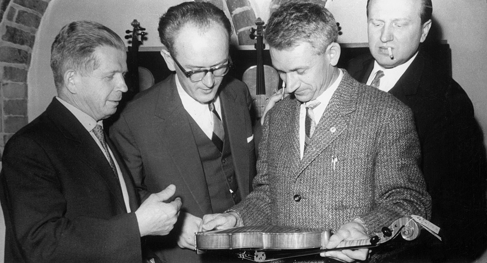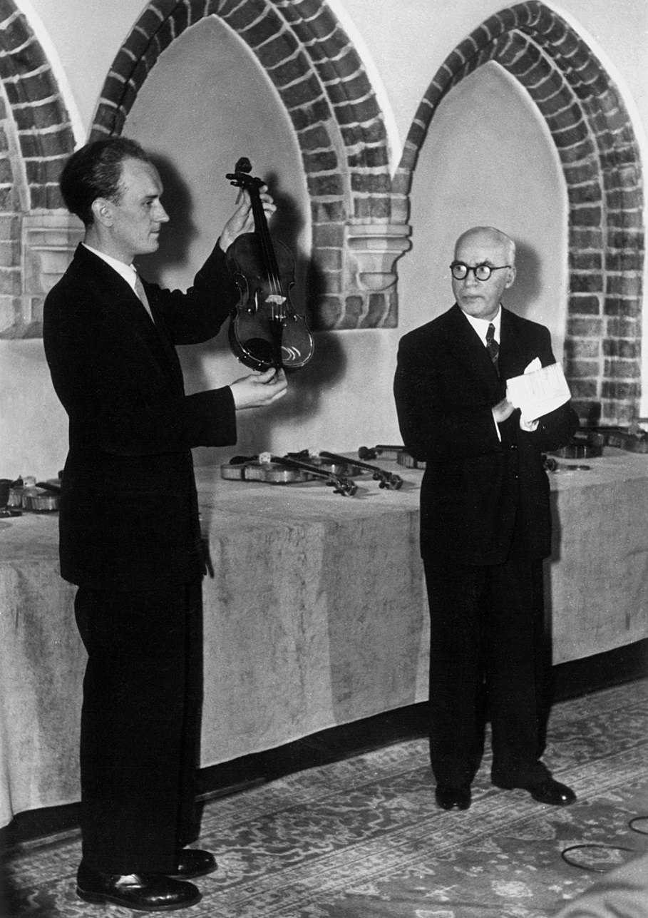 - 1. Międzynarodowy Konkurs Lutniczy im. H. Wieniawskiego (1957). Przewodniczący jury prof. Zdzisław Jahnke (z prawej) ogłasza wyniki 1. Międzynarodowego Konkursu Lutniczego im. H. Wieniawskiego. Nagrodzone instrumenty prezentuje Włodzimierz Kamiński.